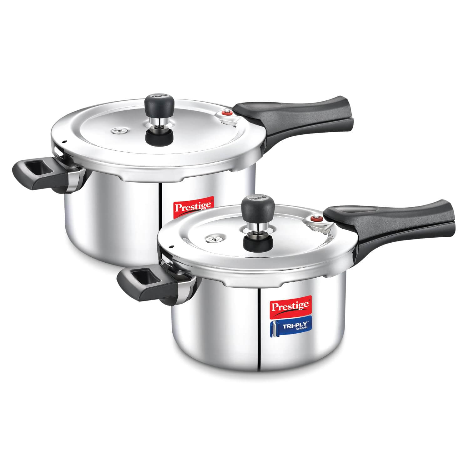 • Prestige Tri-Ply Svachh Outer Lid Pressure Cooker Combi Pack (5L + 3L) - Durable & Spill-Proof