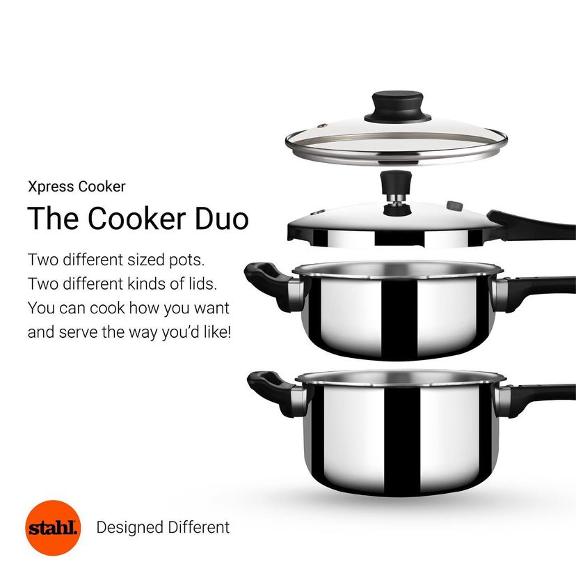 What sets the Stahl Xpress Cooker apart is its dual-lid design. Whether you’re pressure cooking or slow simmering, this combo has you covered with a pressure cooker lid that fits both sizes and a glass lid that allows you to monitor your cooking and serve directly from the pan.