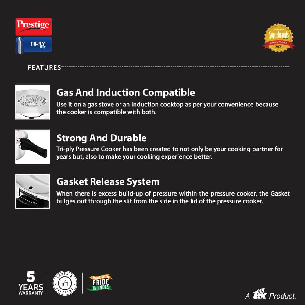 Upgrade your cooking experience with the Prestige Svachh Triply Induction Base Outer Lid Pressure Cooker, designed for modern kitchens. This pressure cooker is crafted with tri-ply stainless steel, which ensures uniform heating and prevents hotspots, making cooking effortless and efficient. The deep Svachh lid is engineered to minimize spills, keeping your stovetop clean from messy, starchy water.