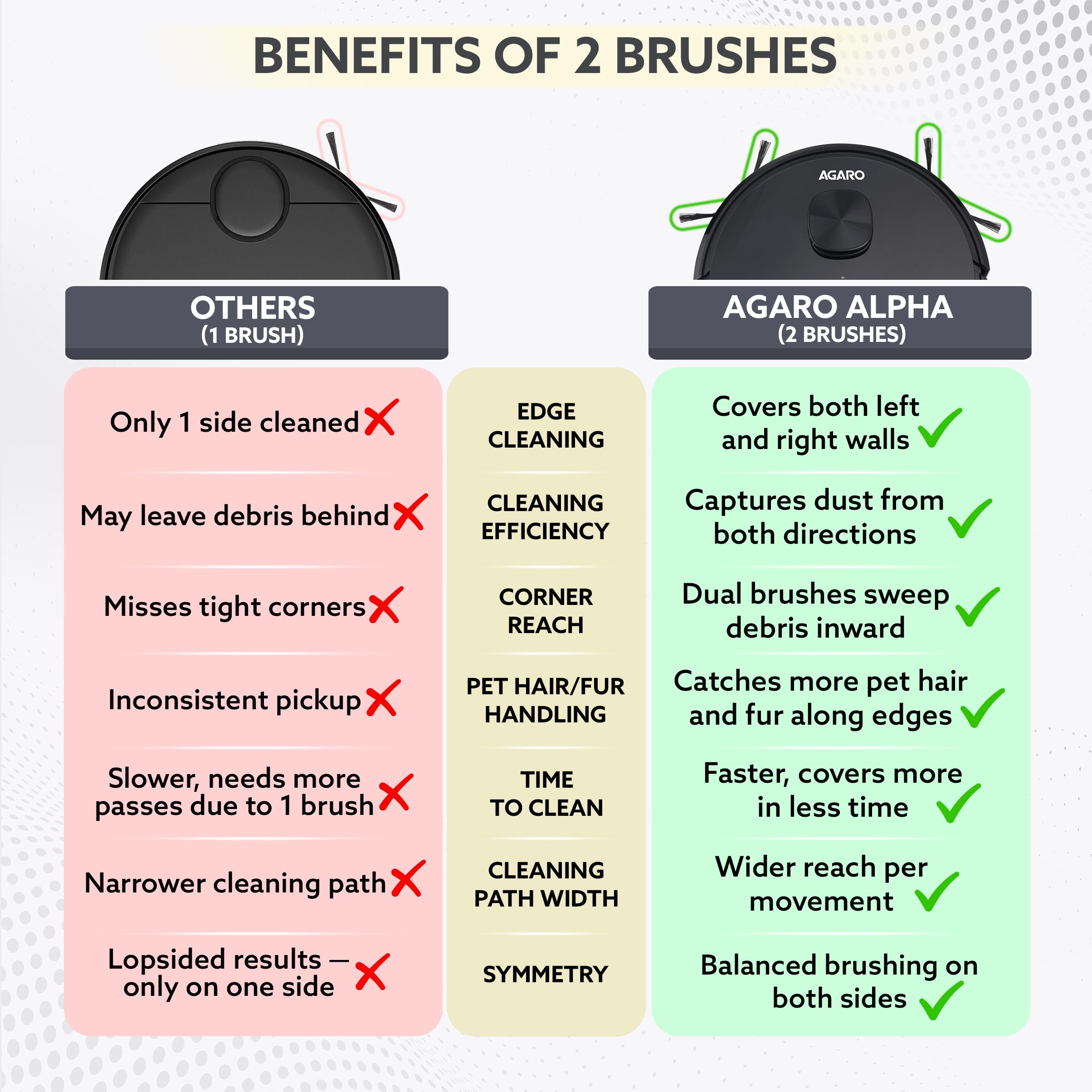 • Dual Side Brushes for Superior Edge & Corner Cleaning – Unlike single-brush robots, the AGARO Alpha features 2 side brushes that cover both left and right walls simultaneously — capturing more dust, pet fur, and crumbs from edges, corners, and along skirting boards in a single pass.
